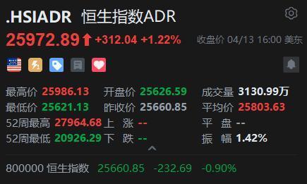 智通财经APP获悉,周一,美股三大指数集体上涨。恒生指数ADR上涨,按比例计算,收报25972.89点,较香港收市升312.04点或1.22%。